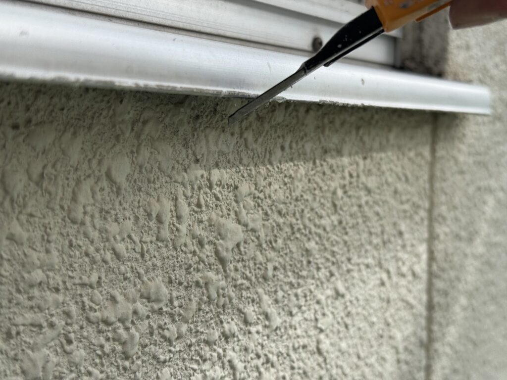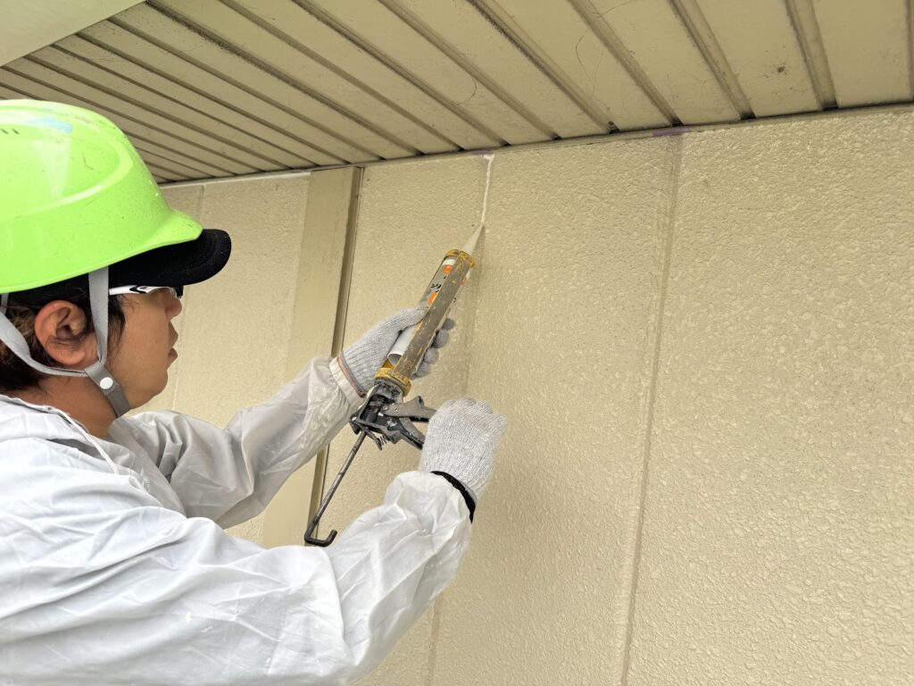 軒裏と外壁の境や、目地の割れなど…コーキングで埋めていきます。