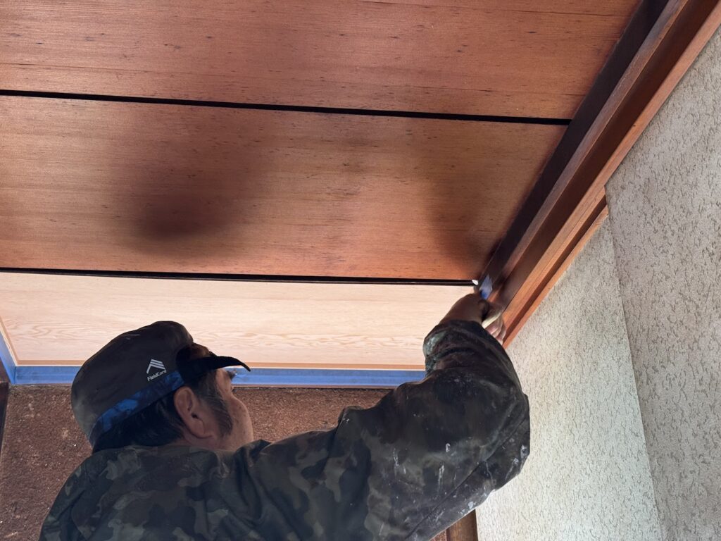 既存の板を汚さないように、テープ養生をしました。