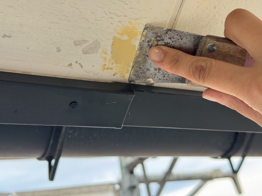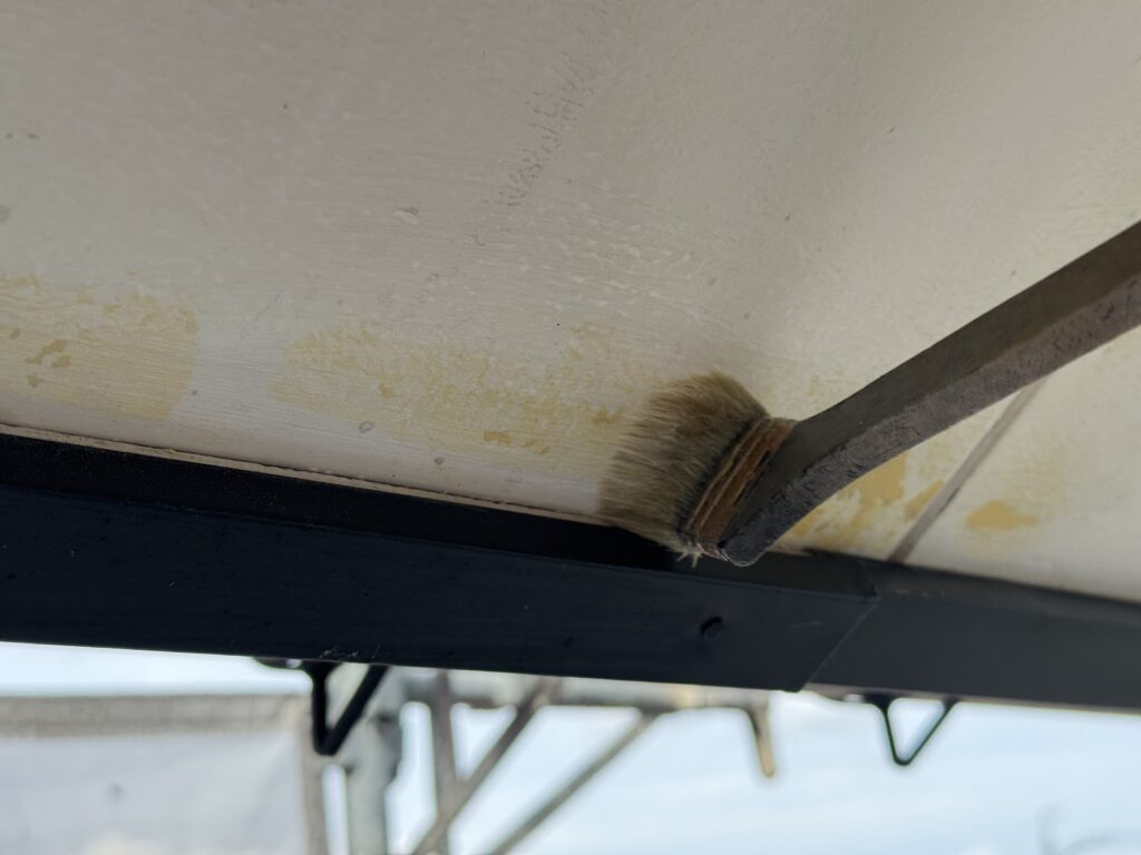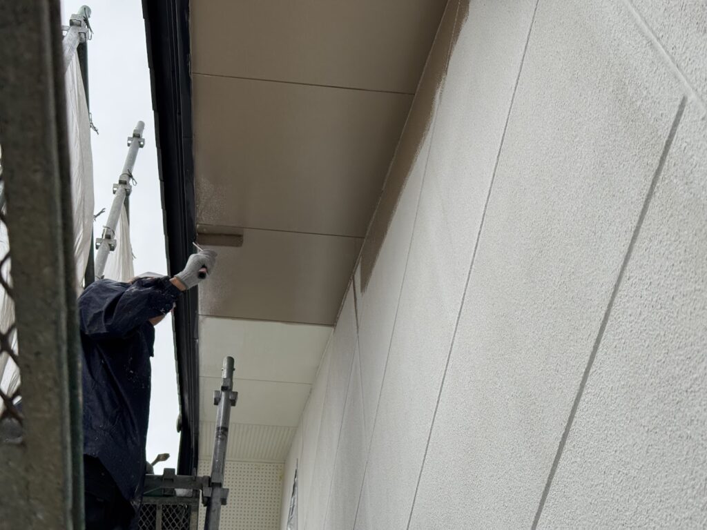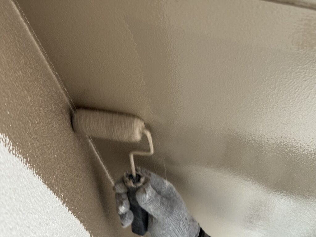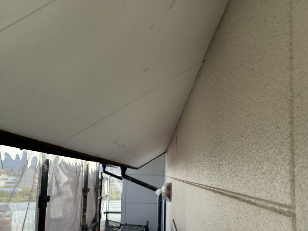 外壁より先に軒裏を仕上げるため、外壁の方へ少し塗り込んでおきます。