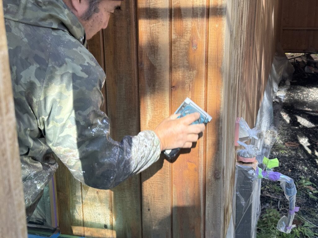 今回は、「着色+上塗り(造膜タイプ)」での施工をおこないます。