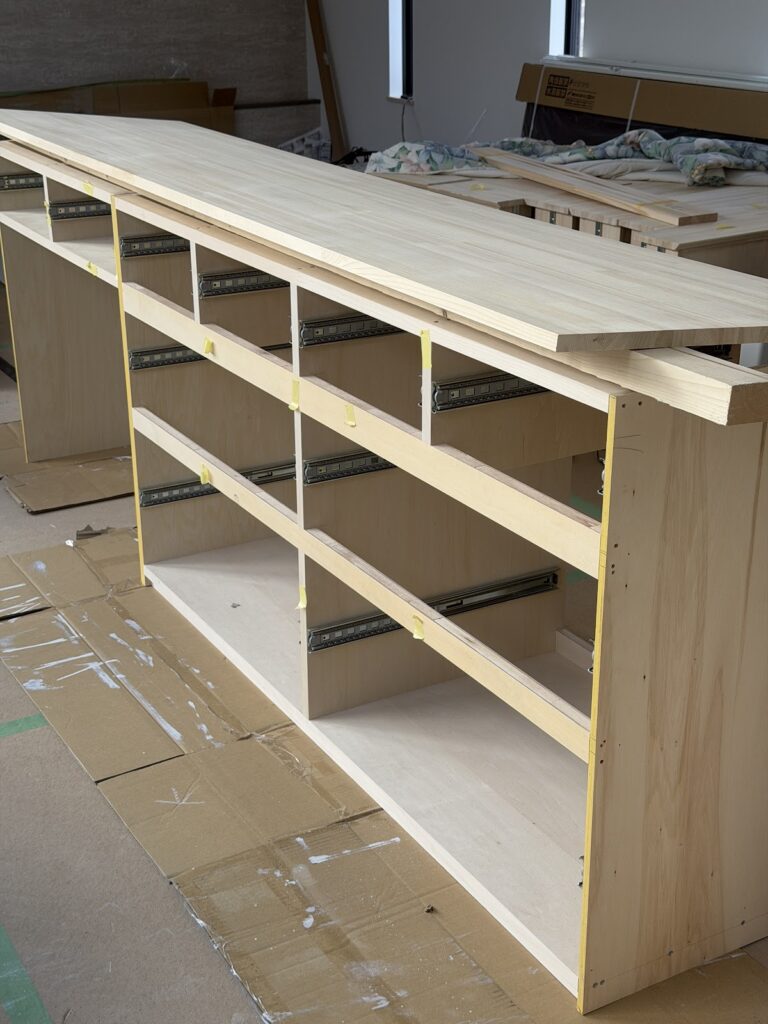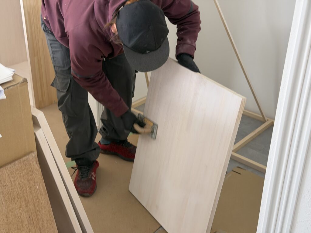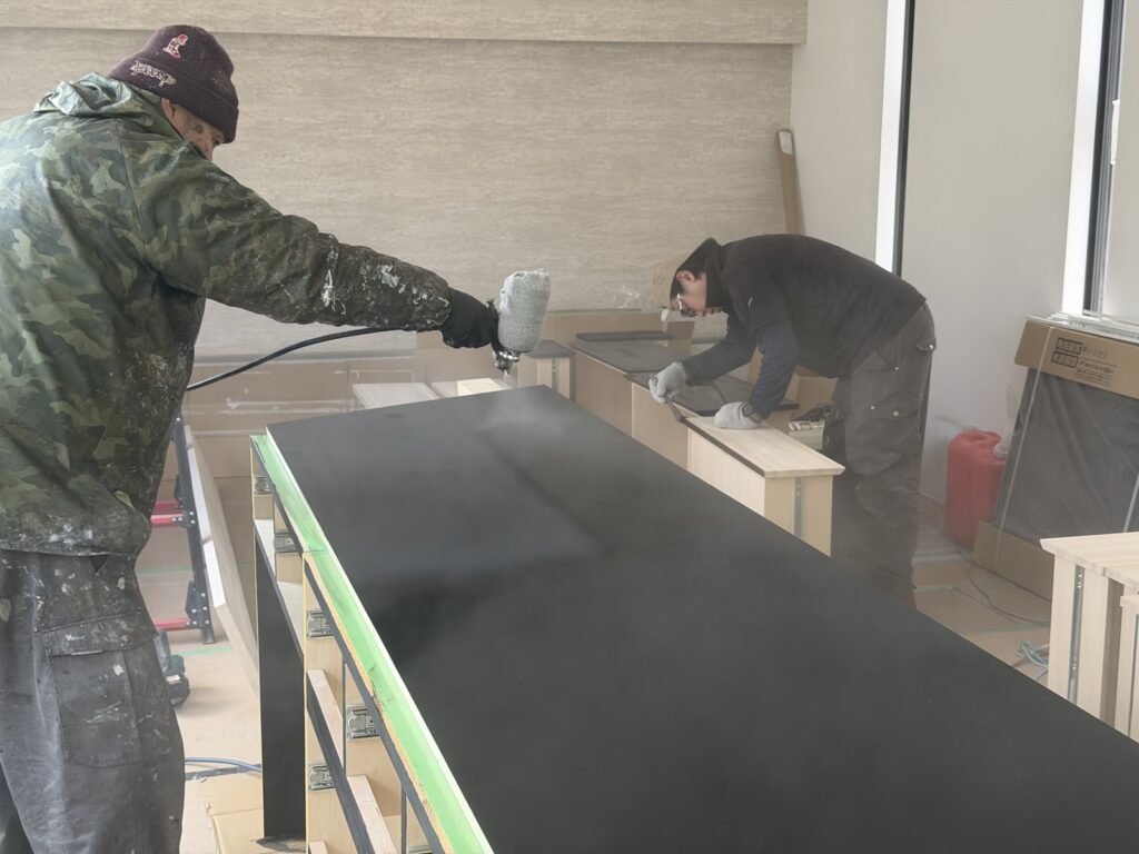キッチンで使用する家具のため 、天板は汚れ防止効果のあるウレタン塗装をしていきます。