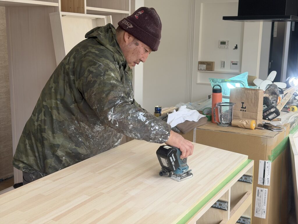 はじめに、天板の表面を整えるためにペーパー当てをしています。