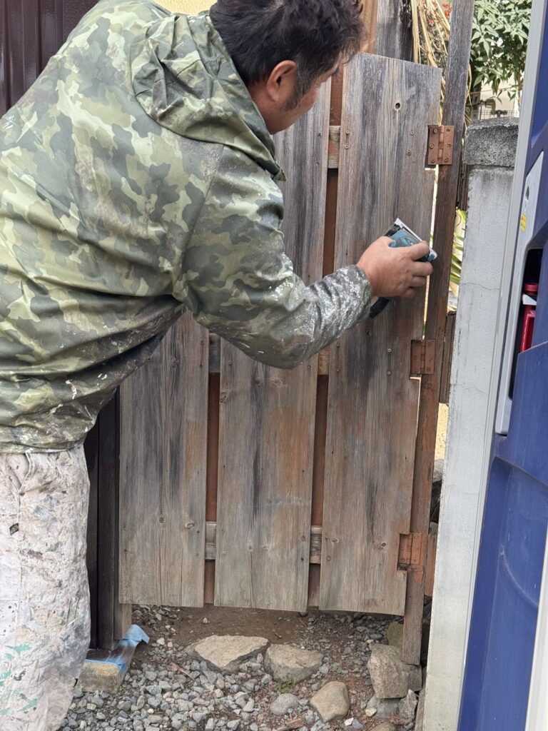 はじめに旧塗膜があるため、サンダー当てをします。