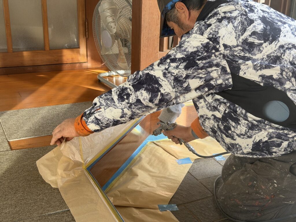 さとう塗そうでは、表面の手触りをより良くするために、ウレタン塗装は基本的には2液タイプの材料でスプレー吹きで施工しています。