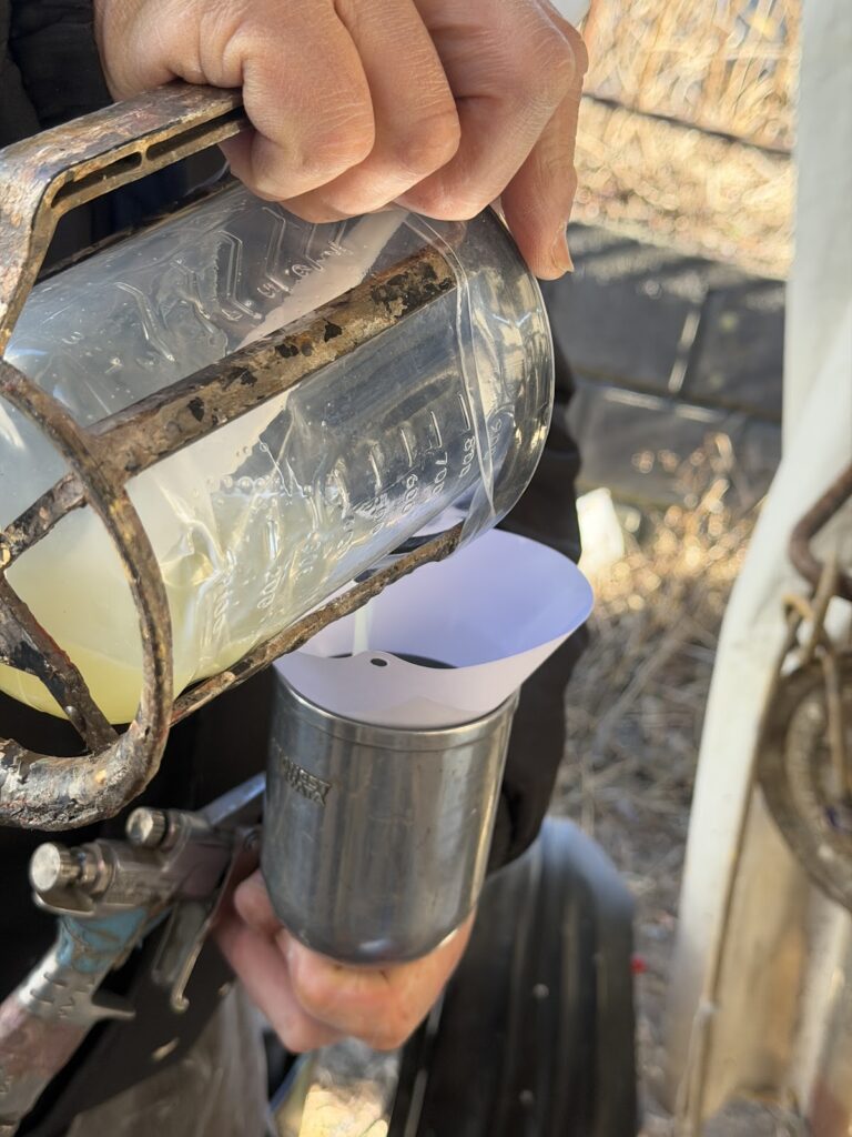 スプレー吹きをする前に、塗料を毎回こして使っています。