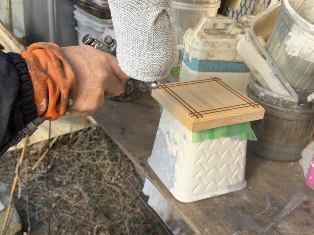 上塗りもシーラー同様、スプレー吹きで塗布していきます。
