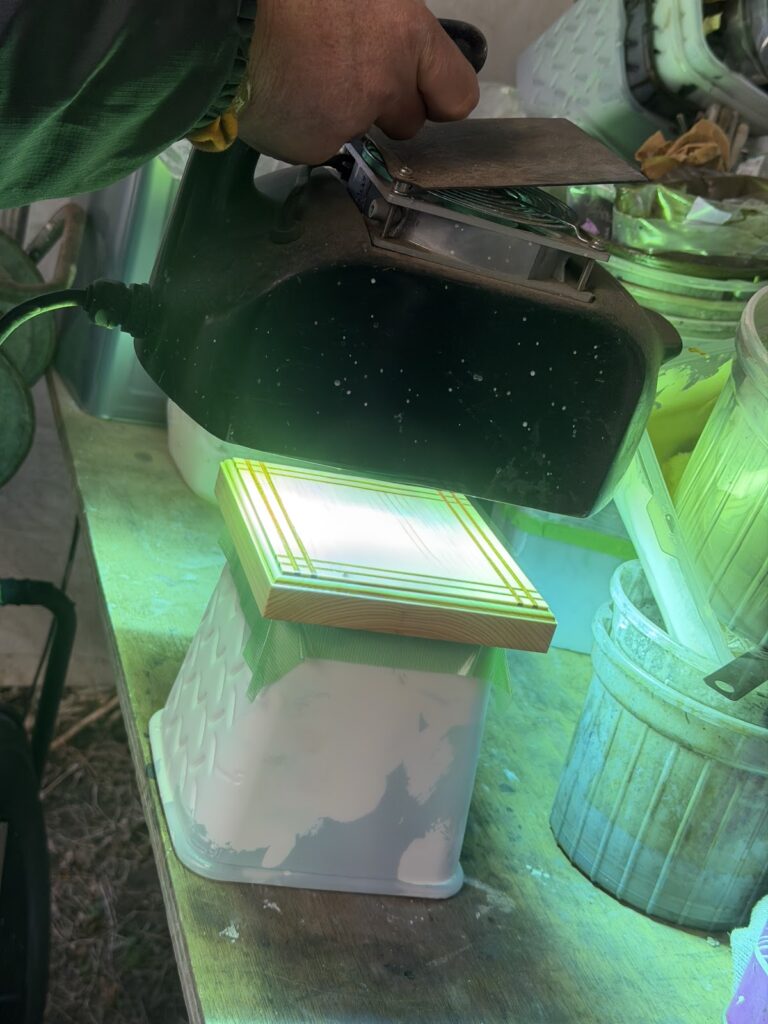 溶剤成分が完全に飛んだら、UVランプを使い、硬化させていきます。